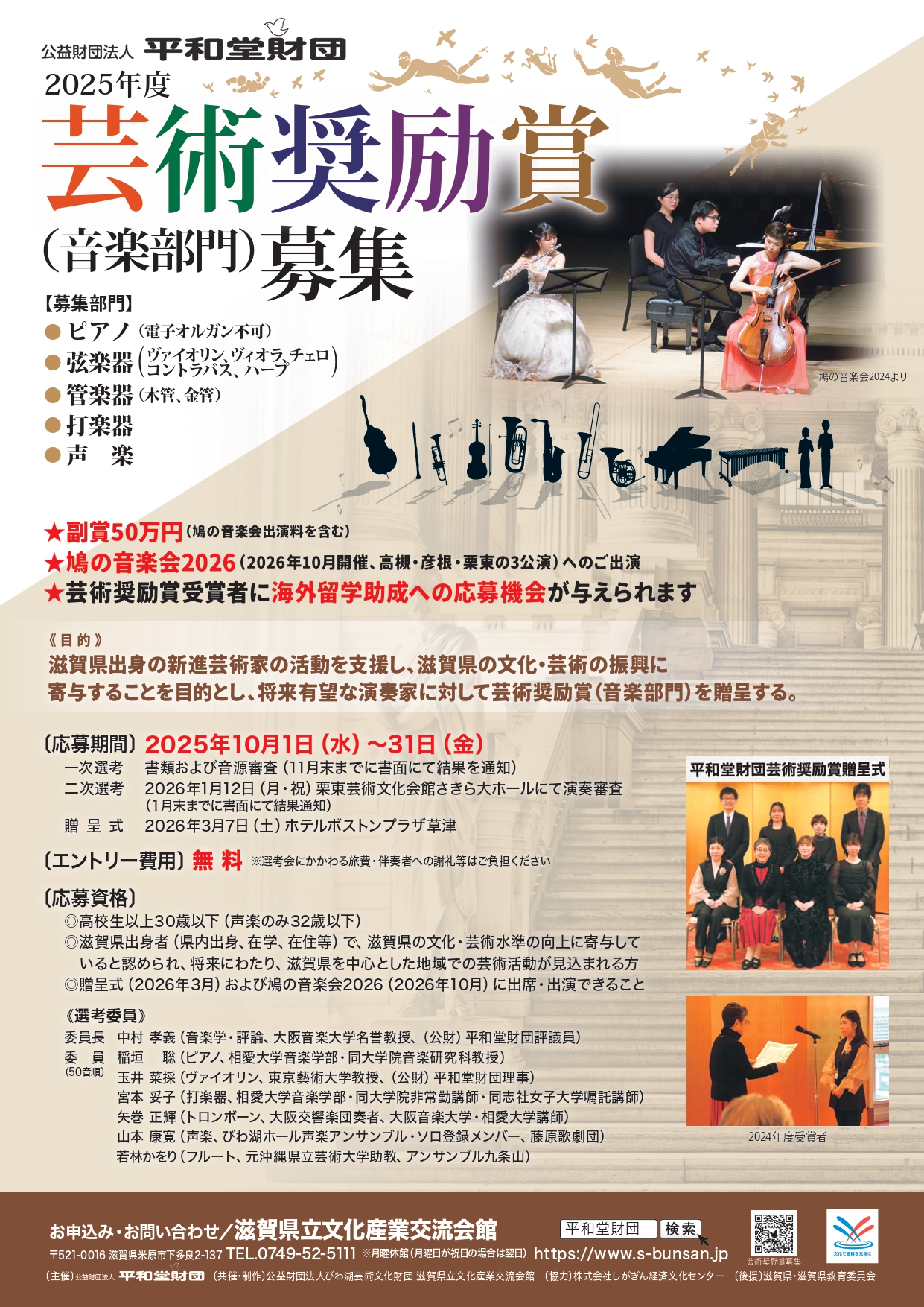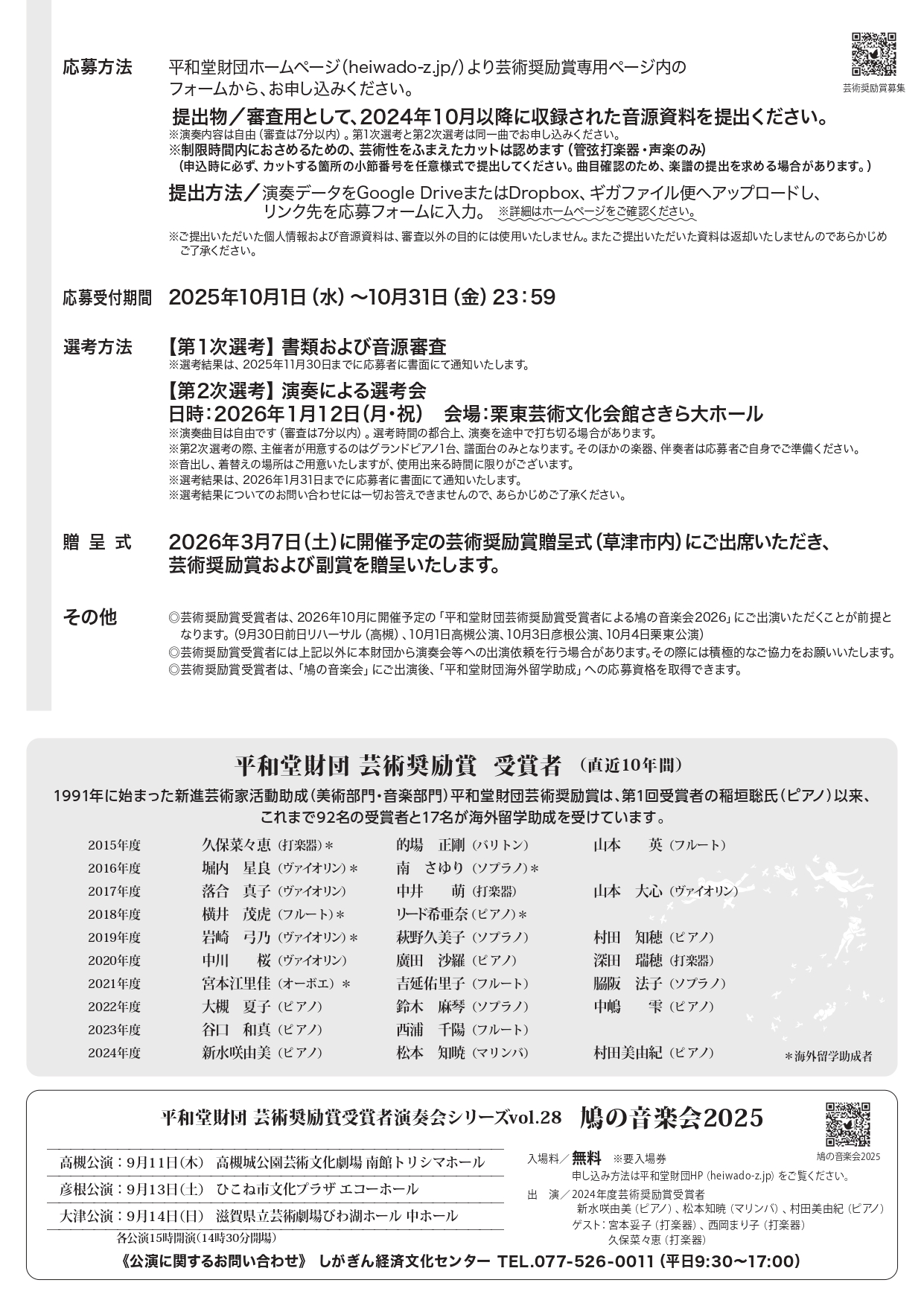 - 芸術奨励賞受賞者は、2026年10月に開催予定の「平和堂財団芸術奨励賞受賞者による鳩の音楽会2026」にご出演いただくことが前提となります。(2026年9月30日前日リハーサル(高槻)、10月1日高槻公演、3日彦根公演、4日栗東公演)